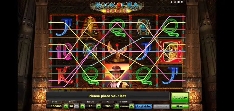 The structure of Book of Ra Magic remains classic and easy to grasp. Operating with 5 reels and ten paylines, this slot allows for flexible selection of line numbers and coin sizes. Rewards are earned by matching symbols inspired by pyramids and other ancient Egyptian motifs, each carrying different payout values.